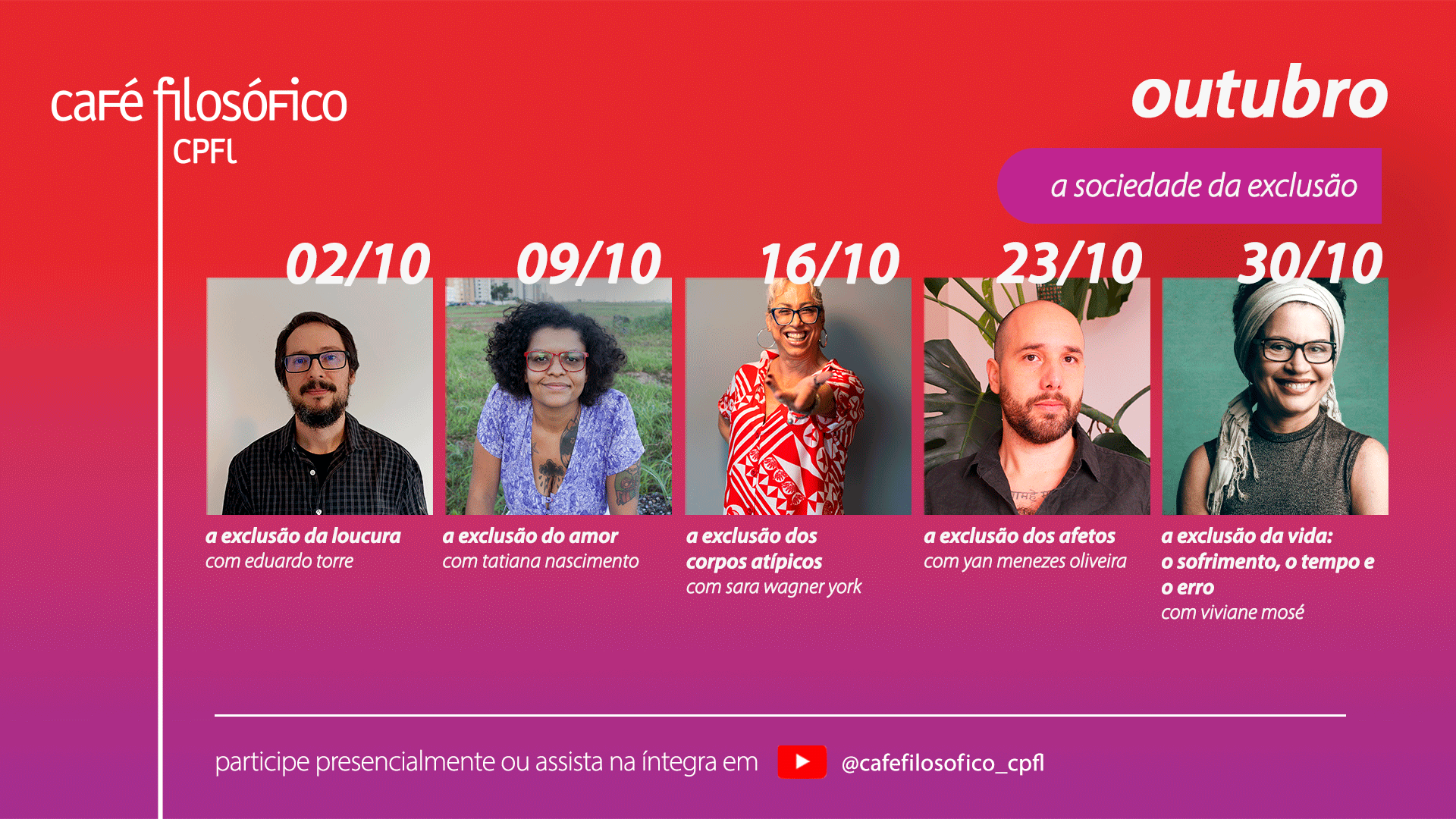 O módulo segue ao longo de outubro com reflexões sobre outras formas de exclusão. No dia 9, a poeta, compositora e cantora Tatiana Nascimento apresenta “A exclusão do amor”, investigando quais amores foram historicamente negados e quem foi privado de vivê-los. Já no dia 16, “A exclusão dos corpos atípicos”, com a jornalista científica Sara Wagner York, discute as violências estruturais contra corpos dissidentes e aponta caminhos para a construção de futuros mais inclusivos. Em 23 de outubro, o psicólogo Yan Menezes Oliveira fala sobre “A exclusão dos afetos”, analisando os impactos de uma racionalidade excludente que reprime a diversidade das experiências afetivas.