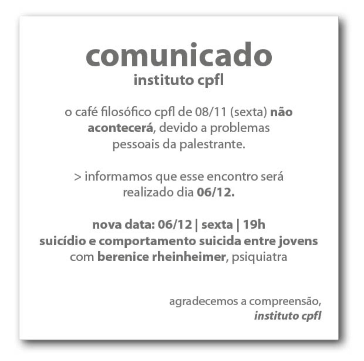 transmissão ao vivo pelo www.facebook.com/institutocpfl, www.facebook.com/cafefilosoficocpfl e www.youtube.com/cafefilosofico